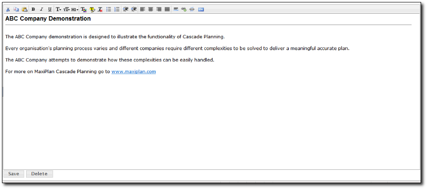 The project management screen provides an HTML wysiwig editor which enables creation of an informative HTML page giving details of the project and incorporating graphics if required. To input a splash screen, go to Project Management under the Planning tab, and click on the button for the project, and the HTML editor will be displayed (initially with a blank screen).