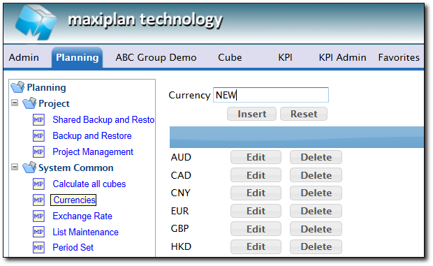 The currencies and currency rate tables are normally defined and maintained by a Planning Administrator on a system-wide basis to ensure consistency across planning applications within the organisation, however it is also possible to define currencies and rates that are local to the project. The instructions below relate to editing the global currency tables, but the same functions are available within a project folder to edit and maintain local currency tables.