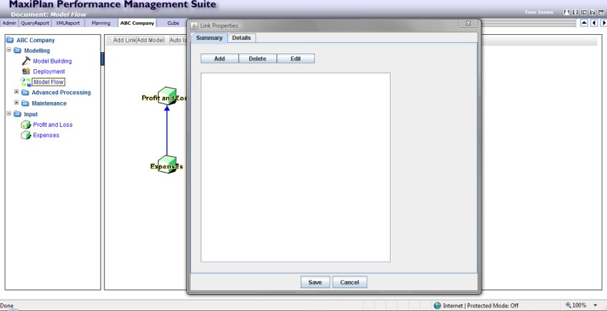 This screen shows the links between the various model cubes and their target model cubes. In our samle above the currently selected model is 'Expenses' highlighted by the green text.