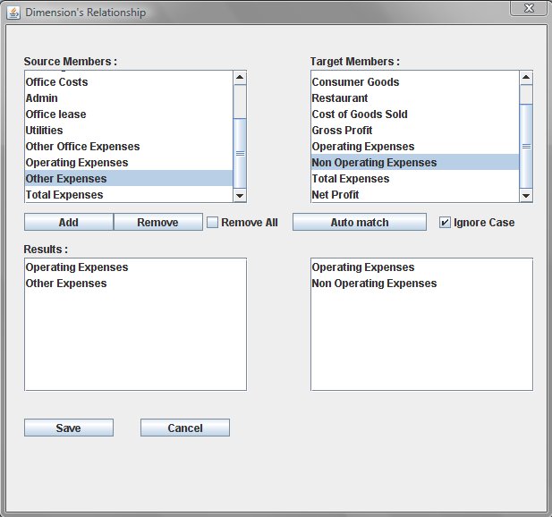 Selecting this button will add the selected source members and target members to the mapped members in the bottom panels. |