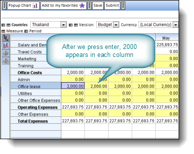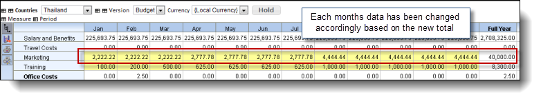 You can enter values and expressions into a total cell in a grid and if the expression is a summation (such as a total for the year), Maxiplan will allocate the new total value across the supporting cells in proportion to their current values.