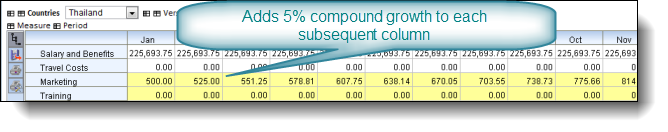 In the example below our Marketing budget starts at 500 and we grow it by 5% compound for each subsequent month. We have keyed in 500g5% into January column and the February to December columns have been set accordingly.