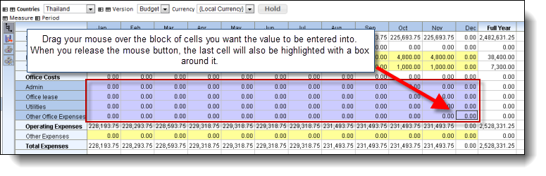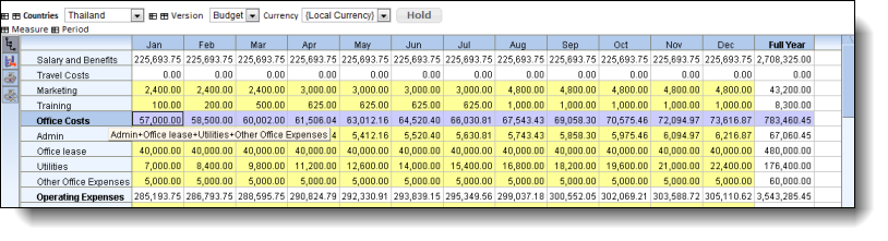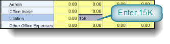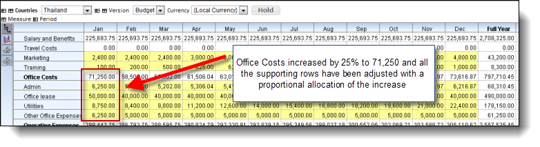 Let's say we wanted to increase our 'Office Costs' for January by 25%, we could enter into the 'Office Costs' for Jan cell, the expression '=*1.25' and press enter. This would increase our 'Office Costs' for Jan to 71,250, and this amount would be allocated to each of the Jan cells for 'Admin', 'Office Lease', 'Utilities' and 'Other Office Expenses' proportionally.