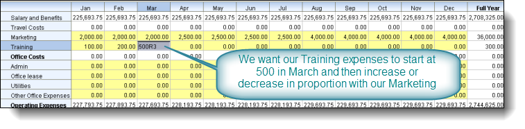 Let's suppose we wanted to make our Training budget from March onwards proportional to our Marketing budget starting with a base value of 500: