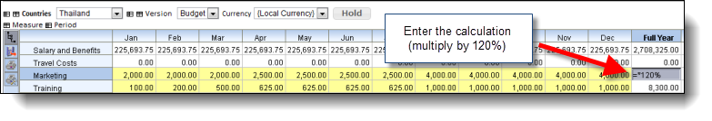 You could also enter an expression. Let's say for the same example above we wanted to apply a 20% increase to our Marketing budget. We simply enter in the expression '=*1.20' or alternatively '=*120%' which will apply a 20% increase to the existing value: