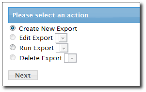 Create New Export - this option will guide you through a series of steps that will allow you to create a new export.