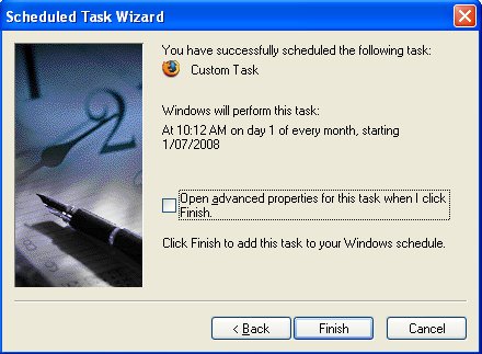 After confirming Username and Password, click on 'Finish' to allow the wizard to create the scheduled task.