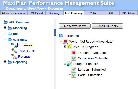 Workflow refers to the management of the submission of spreadsheets deployed to users, and provides the mechanism to manage the status and flow of data in a planning cycle involving the collection of budget submissions, review and consolidation. When deploying slices (spreadsheets) of a model to various users as either 'Owners' or 'Reviewers', workflow is automatically created to allow us to monitor and track the submission and review process, identifying the status of eavh node and the status of the consolidation process.