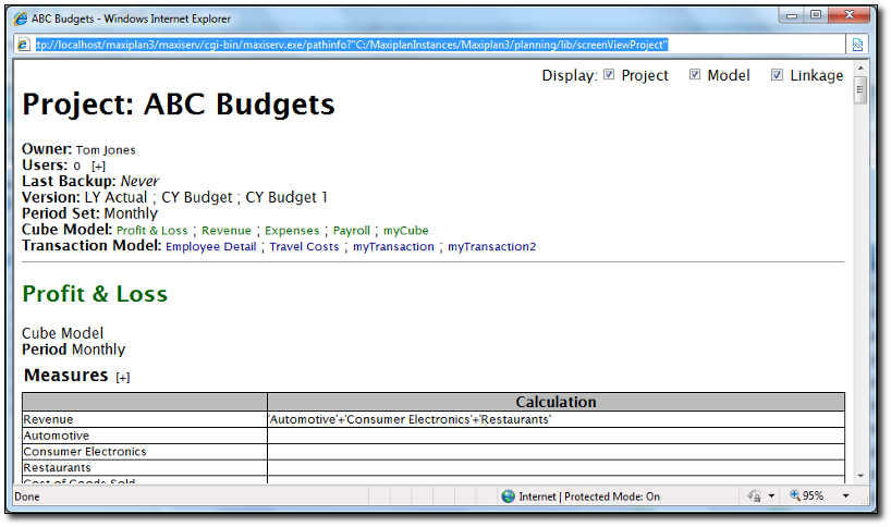 Details of the project, models found in the project, linkages found within the project, period set and version can be found in this window.