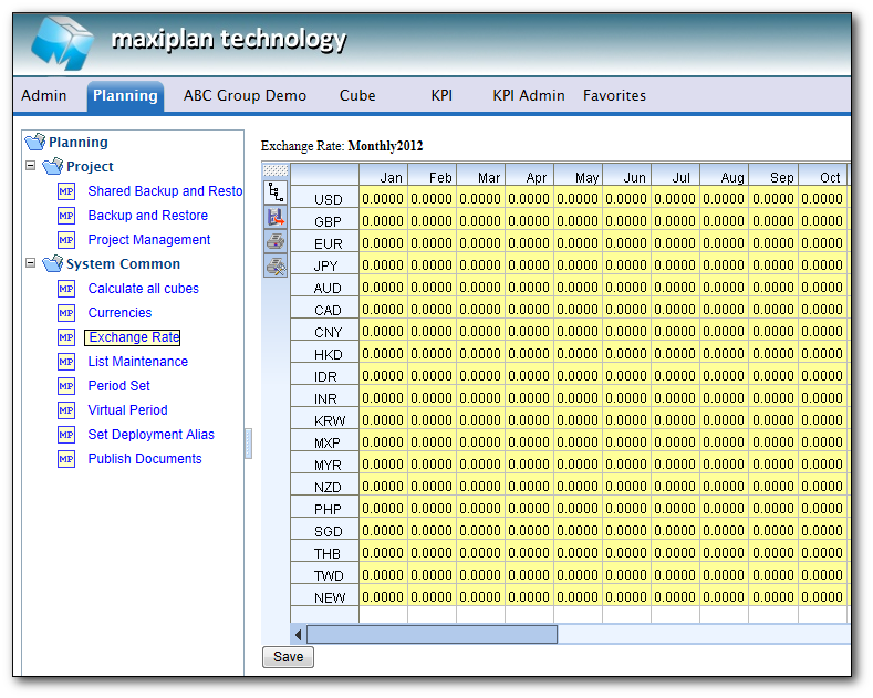 To add a new Rate Table, select Planning>System Common>Exchange Rate and then enter the name of the new Rate Table in the entry box at the top of the screen.