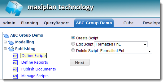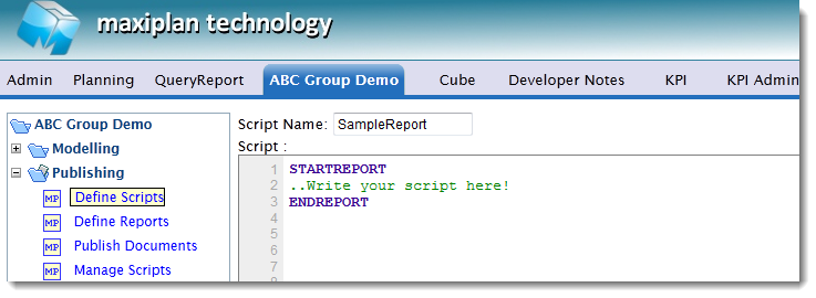 The Define Scripts function provides a script editor for both report and application scripts. To create a new report script select the Create Script option: