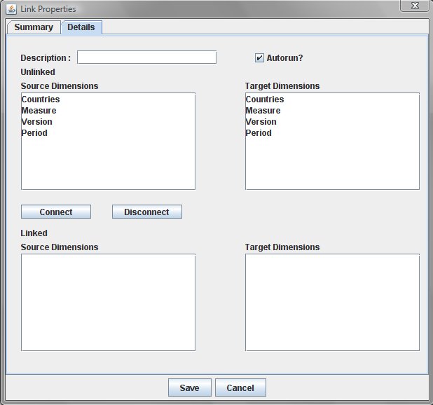 In the example we have used, we have the same number of dimensions on each side of the link, and the source dimensions can be connected to its corresponding target dimension easily. However, we will not always have the same number of dimensions for the source and target models, and even if the number of dimensions is the same on each side, they may not all be linked.