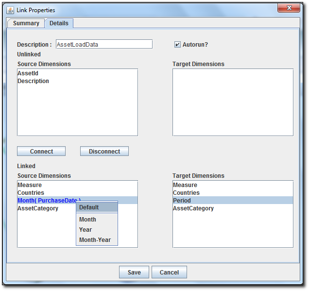 To dynamically map the transaction model date field with a cube model period dimension containing only month or only year or month and year, first connect the two dimensions as described above, and then in the left linked source list, right click on the date field, and from the menu list select either MONTH, YEAR or MONTH-YEAR as the format. The date field will be highlighted in blue with the format requested.