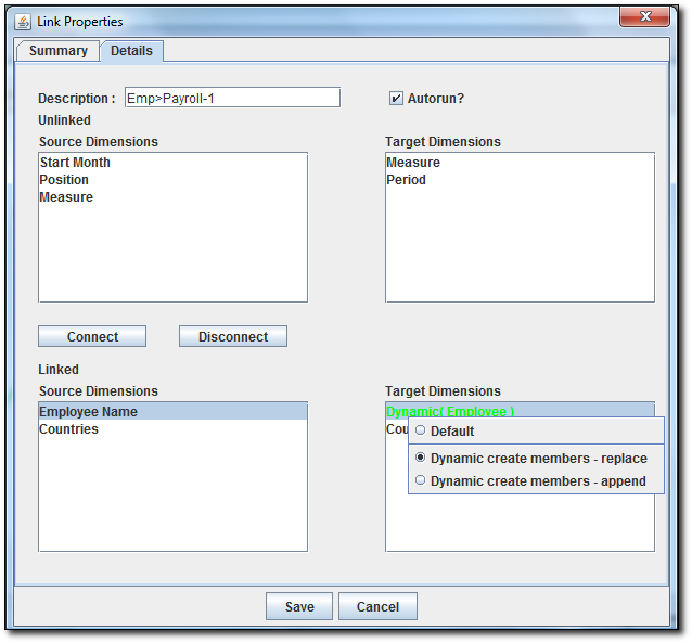 To define custom mapping, in the connections popup window, go to the Linked Source Dimensions panel (the lower left panel), and double click on the dimension name corresponding to the dimension pair you wish to edit. A second popup window will appear.