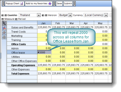 Note that when inputting a value or expression into a total column, if the input cells that support it are all zeros, then the value will be allocated evenly across those cells. This is a very useful feature when you want to input an annual total as the system will allocate this back to the months evenly. Similarly for data entered into quarters it will be allocated back to the months that make up those quarters.