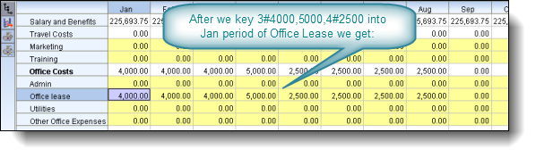 Let's say we wanted to increase our 'Office Costs' for January by 25%, we could enter into the 'Office Costs' for Jan cell, the expression '=*1.25' and press enter. This would increase our 'Office Costs' for Jan to 71,250, and this amount would be allocated to each of the Jan cells for 'Admin', 'Office Lease', 'Utilities' and 'Other Office Expenses' proportionally.