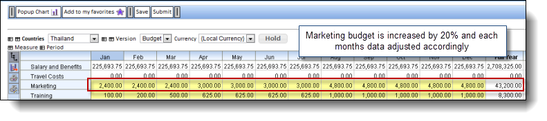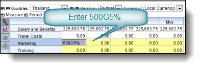 You could also enter an expression. Let's say for the same example above we wanted to apply a 20% increase to our Marketing budget. We simply enter in the expression '=*1.20' or alternatively '=*120%' which will apply a 20% increase to the existing value:
