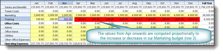 Let's suppose we wanted to make our Training budget from March onwards proportional to our Marketing budget starting with a base value of 500: