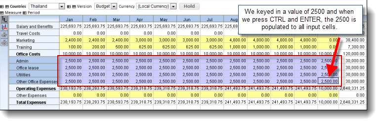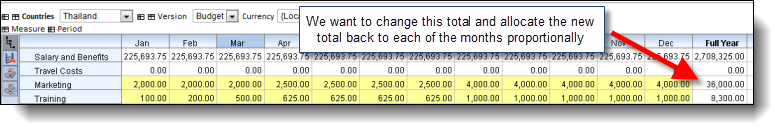 You can enter values and expressions into a total cell in a grid and if the expression is a summation (such as a total for the year), Maxiplan will allocate the new total value across the supporting cells in proportion to their current values.