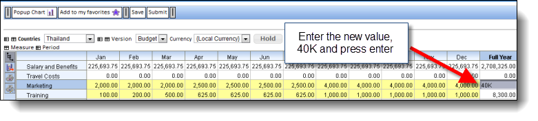Let's say we wanted to make this marketing total 40,000. We can simply enter in a new value in the total cell, say 40K: