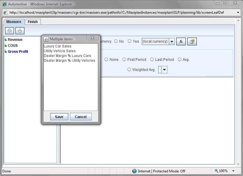 2.Another popup window will appear where we can enter in the additional measures. Just enter them in without the single quote characters as MaxiPlan will add these in for you automatically.
