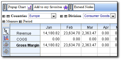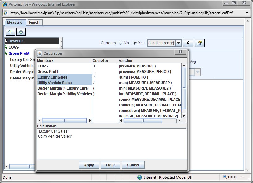 4. Next we need to add the calculations for the 'Revenue' and 'COGS' measures. To add a calculation to a measure, select the measure you wish to add the calculation to ('Revenue' for example) and then click the button which will open the measure calculation popup window. The bottom part of the popup is the expression window and shows the calculation, and in the top half on the left is a list of the measures we have available to use in our expression,and in the middle is a list of mathematical operators we can use, and finally on the right hand side is a list of special functions available. Using the mouse I can select and then drag the members into the expression window. Similarly I can select and drag any of the arithmetic operators or functions to the expression window. To select an item click it once. To drag a selected item click it again and drag it to whereer you want it to be in the expression window and release the mosue button. You can select multiple measures at once by holding the CTRL key down whilst you select multiple items, or to select a range you can select the first item and then hold the SHIFT key down while you select the last item in the range.