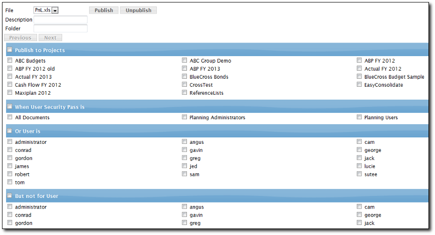 Users are allowed to publish documents on Maxiplan and restrict which fellow users are able to access the published contents.